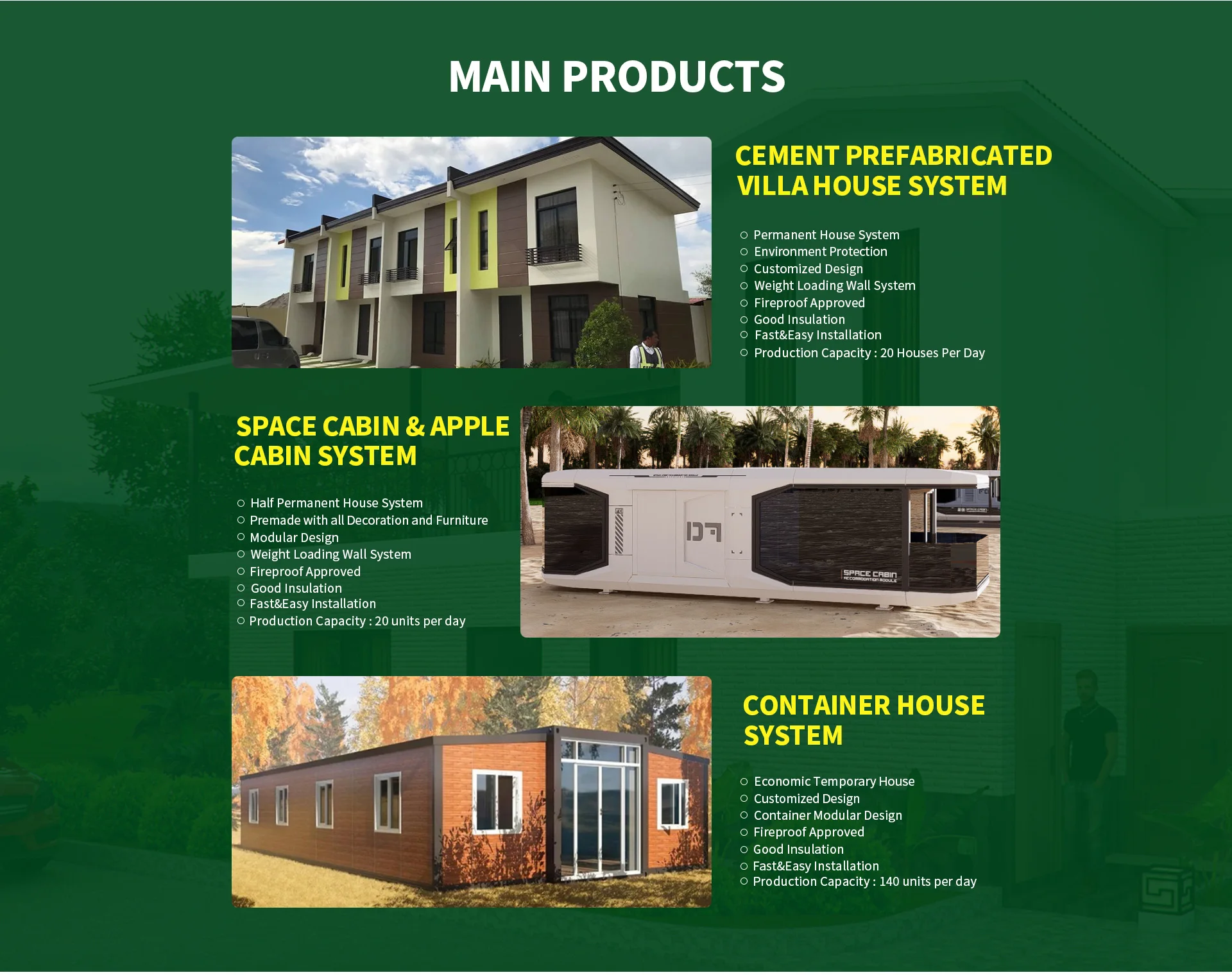 Principais produtos:Casas de painel sanduíche, casas de contêineres, cabines de maçã, casas pré-fabricadas de cimento, cápsulas espaciais